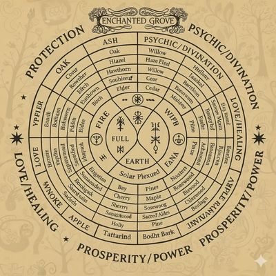 Across cultures and centuries, trees have stood as silent witnesses to the mysteries of existence—roots deep in the unseen, branches lifted toward the heavens. In witchcraft and psychic practice, sacred woods act as bridges between worlds, each species carrying its own elemental, planetary, and archetypal resonance. These qualities shape how a wood supports ritual, divination, and meditative work. When organized into a table, their correspondences reveal a woven pattern of cosmic relationships, helping practitioners choose and craft tools that align with the deeper order moving through all things.